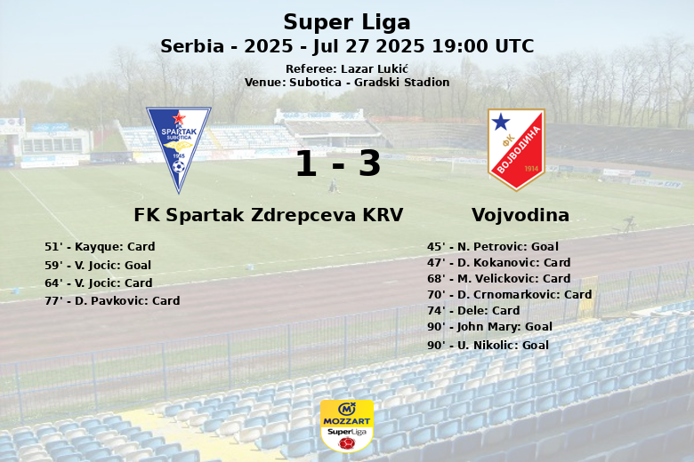Nos minutos finais, quando parecia que o Spartak conquistaria a vitória, John Mary marcou aos 90 minutos, assistido por U. Nikolic, reacendendo as esperanças do Vojvodina. Imediatamente depois, o Vojvodina voltou a marcar, desta vez com um gol de U. Nikolic assistido por M. Velickovic, selando o empate. Apesar da maior posse de bola e chutes do Vojvodina, o Spartak provou ser um adversário difícil, cometendo 16 faltas e recebendo 3 cartões amarelos, enquanto o Vojvodina cometeu 17 faltas e recebeu 4 cartões amarelos. No final, o resultado de 3-2 refletiu um jogo emocionante e competitivo.