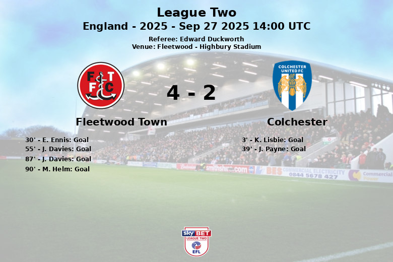 Fleetwood, Inglaterra – Em uma partida emocionante realizada no Highbury Stadium, o Fleetwood Town derrotou o Colchester em um confronto cheio de gols. O Colchester surpreendeu logo no início com um gol de K. Lisbie aos 3 minutos, com assistência de J. Payne. O Fleetwood respondeu aos 30 minutos com um gol de E. Ennis, com assistência de F. Potter. O primeiro tempo continuou em ritmo frenético, com J. Payne marcando um pênalti para o Colchester aos 39 minutos, levando o placar a um momentâneo 1-2.
