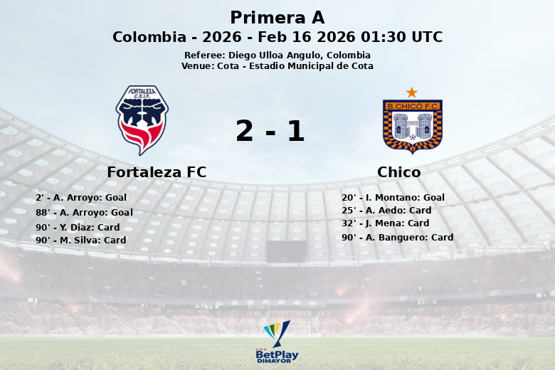Cota, Colômbia – Em um encontro disputado no Estádio Municipal de Cota, o Fortaleza FC impôs-se ao Chico com um placar de 2 a 1, em partida válida pela sétima rodada da Primeira A colombiana. A equipe da casa demonstrou superioridade, evidenciada na sua posse de bola de 64% e no seu maior número de chutes, 16 no total, dos quais 7 foram ao gol.