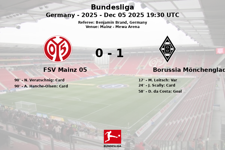 A partida terminou com dois cartões amarelos para o Mainz nos minutos finais, com N. Veratschnig e A. Hanche-Olsen recebendo advertências. O árbitro, Benjamin Brand, oficiou a partida intensa. Mainz liderou em escanteios com 8, enquanto o Borussia obteve 6.