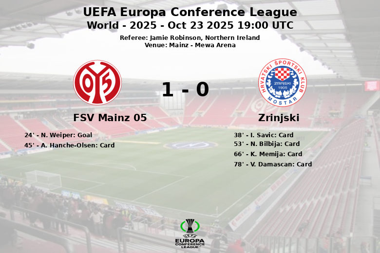 O Zrinjski, apesar de ter menos posse de bola (39%), buscou criar perigo no contra-ataque, mas encontrou uma defesa bem organizada do Mainz. A expulsão de I. Savic aos 38 minutos complicou ainda mais as aspirações da equipe visitante. A partida foi marcada por vários cartões, com quatro cartões amarelos para o Zrinjski e um para o Mainz. A superioridade numérica e o controle de bola permitiram ao Mainz administrar o restante da partida até o apito final.