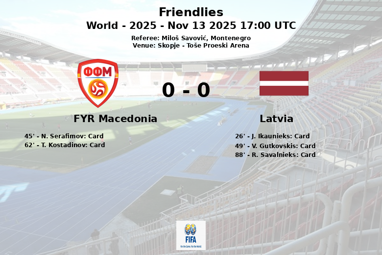 Skopje foi o palco de um amistoso entre Macedônia do Norte e Letônia que terminou empatado em 0 a 0. A partida, disputada na Toše Proeski Arena, sob o olhar atento do árbitro montenegrino Miloš Savović, foi marcada pela igualdade na posse de bola (50% para cada equipe) e uma notável falta de efetividade em frente ao gol.