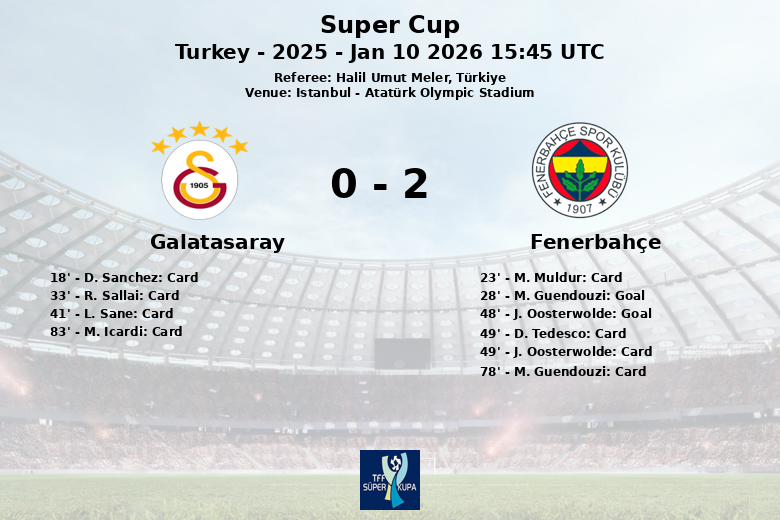 O Fenerbahçe abriu o placar aos 28 minutos com um gol de M. Guendouzi, assistido por L. Mercan. A vantagem foi ampliada no início do segundo tempo, aos 48 minutos, com um gol de J. Oosterwolde, após uma assistência de M. Asensio.