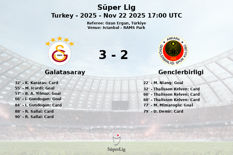 O Genclerbirligi surpreendeu ao abrir o placar aos 22 minutos com um gol de M. Niang, assistido por G. Gurpuz. No entanto, o Galatasaray respondeu no segundo tempo. M. Icardi empatou aos 55 minutos com um gol assistido por K. Karatas. Pouco depois, B. A. Yilmaz colocou o Galatasaray na frente aos 57 minutos. I. Gundogan ampliou a vantagem aos 66 minutos com uma assistência de B. A. Yilmaz. O Genclerbirligi tentou reagir e M. Mimaroglu marcou aos 77 minutos com uma assistência de S. Onur.