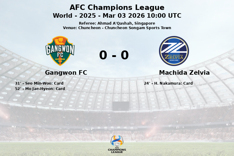 A partida, arbitrada por Ahmad A’Qashah de Singapura, foi marcada pela intensidade e pela disputa no meio-campo. As estatísticas refletem um domínio territorial do Gangwon FC, com 10 chutes totais, embora apenas 2 tenham conseguido ser direcionados ao gol adversário. Por sua vez, o Machida Zelvia, com 43% de posse, tentou aproveitar seus 8 remates, conseguindo colocar 3 entre as três traves.
