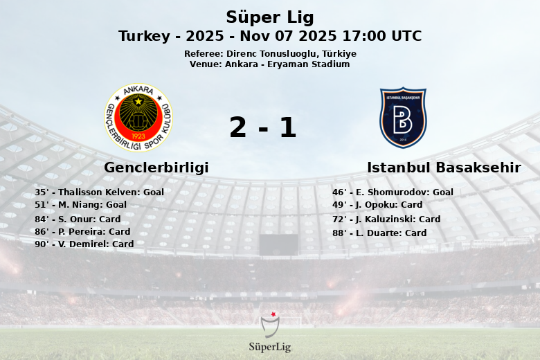 A vantagem do Genclerbirligi foi restabelecida aos 51 minutos, quando M. Niang converteu um pênalti. O restante da partida foi caracterizado por uma série de advertências, refletindo a tensão em campo. J. Opoku (49′), J. Kaluzinski (72′), L. Duarte (88′) pelo Istanbul Basaksehir, e S. Onur (84′), P. Pereira (86′), V. Demirel (90′) do Genclerbirligi receberam cartões amarelos.