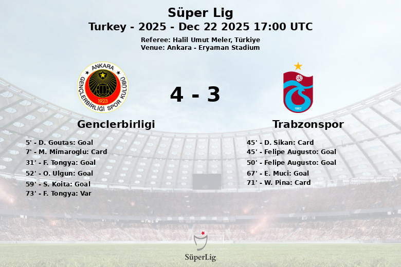 Ancara foi palco de uma partida vibrante no Estádio Eryaman, onde Genclerbirligi e Trabzonspor empataram em um duelo cheio de alternativas e gols. A equipe da casa, Genclerbirligi, com 37% de posse de bola, demonstrou eficácia no ataque, gerando 18 chutes, dos quais 9 foram no alvo. D. Goutas abriu o placar logo aos 5 minutos, assistido por G. Gurpuz, seguido por um gol de F. Tongya aos 31 minutos, assistido por O. Ulgun. No entanto, o Trabzonspor, com 63% de posse de bola, não se rendeu. Felipe Augusto diminuiu a desvantagem pouco antes do intervalo e empatou a partida no início do segundo tempo, ambos os gols assistidos por W. Pina e E. Muci, respectivamente. O. Ulgun colocou o Genclerbirligi à frente novamente aos 52 minutos, assistido por M. Mimaroglu, e S. Koita ampliou a vantagem aos 59 minutos, assistido novamente por G. Gurpuz. O Trabzonspor respondeu com um pênalti convertido por E. Muci aos 67 minutos. Um gol de F. Tongya foi anulado por impedimento. A partida, arbitrada por Halil Umut Meler, foi caracterizada por um jogo intenso, refletido nas 6 faltas cometidas pelo Genclerbirligi e nas 14 do Trabzonspor. O Genclerbirligi recebeu um cartão amarelo, enquanto o Trabzonspor viu dois. Apesar do domínio do Trabzonspor na posse de bola, o Genclerbirligi demonstrou ser perigoso no contra-ataque, deixando um empate que soube a pouco para ambas as equipes.