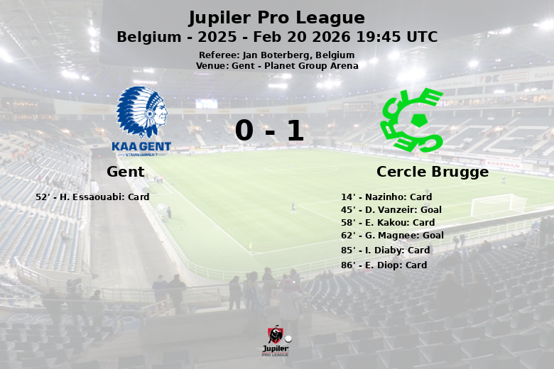 Gent, Bélgica – 20 de fevereiro de 2026 – O Cercle Brugge venceu o Gent no Planet Group Arena em uma partida correspondente à 26ª rodada da Jupiler Pro League. O jogo, arbitrado por Jan Boterberg, foi marcado pela superioridade do Cercle Brugge, que se refletiu na posse de bola (55%) e no número de chutes a gol (20), embora apenas quatro tenham sido no alvo.