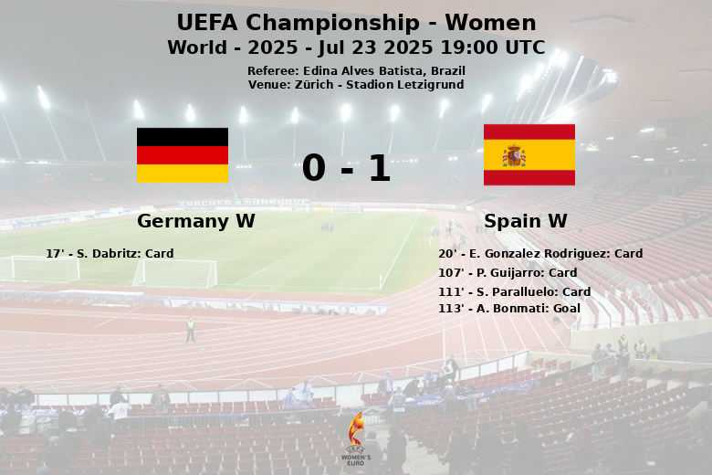 O jogo foi caracterizado por uma forte disputa no meio-campo, evidenciada pelas 20 faltas cometidas pela Espanha e as 14 da Alemanha. A árbitra brasileira Edina Alves Batista mostrou quatro cartões amarelos, um para a Alemanha e três para a Espanha. O golo decisivo surgiu aos 113 minutos, por A. Bonmati após uma assistência de A. del Castillo, libertando a euforia do lado espanhol e selando a sua passagem à final. A partida ocorreu no contexto do Campeonato da UEFA – Feminino, temporada 2025, em sua rodada de semifinais.