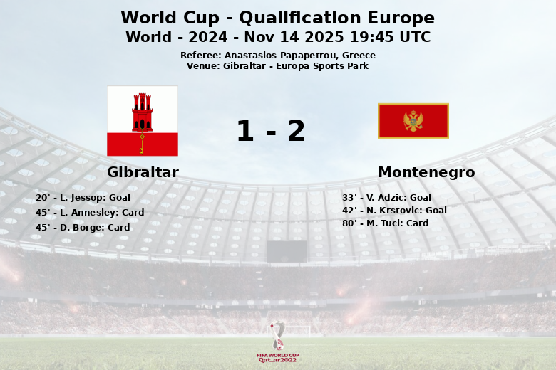 Gibraltar, jogando em casa, surpreendeu inicialmente ao abrir o placar aos 20 minutos com um gol de L. Jessop, assistido por J. Scanlon. No entanto, a alegria local durou pouco. Montenegro reagiu com força, com V. Adzic empatando aos 33 minutos. Antes do intervalo, N. Krstovic converteu um pênalti aos 42 minutos, dando a vantagem aos visitantes.