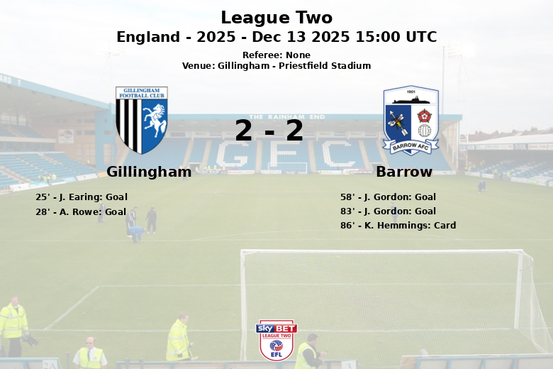 Gillingham, Inglaterra – Uma partida vibrante no Priestfield Stadium concluiu com um empate que deixou os torcedores na ponta de seus assentos. O confronto, correspondente à 20ª rodada da League Two, viu o Gillingham sair na frente com um gol contra de J. Earing aos 25 minutos e um gol de A. Rowe aos 28 minutos, com assistência de E. Coleman. Parecia que os donos da casa estavam no controle do jogo.