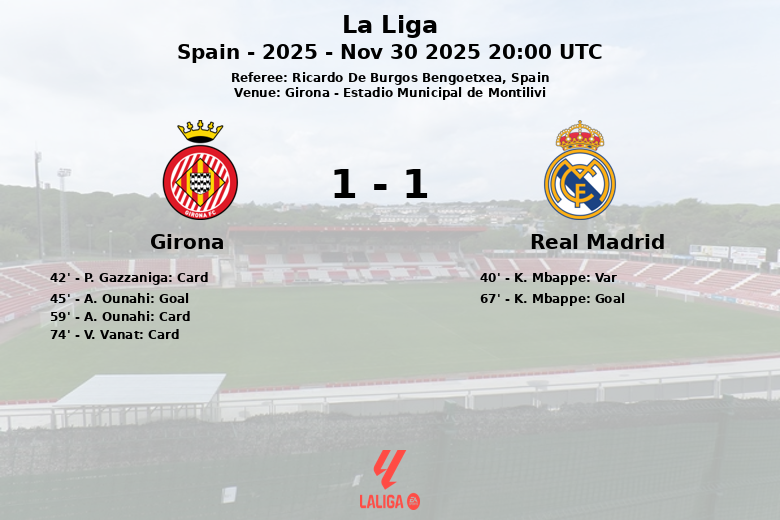 Apesar do domínio do Real Madrid na posse de bola e nos chutes a gol (24 chutes totais contra 10 do Girona), a equipe local soube defender sua área e manter o empate. O encontro terminou com alta intensidade, refletida nas 13 faltas cometidas pelo Real Madrid e nas 9 do Girona, assim como nos 3 cartões amarelos mostrados ao Girona. O resultado final reflete a paridade da partida e a dificuldade que o Real Madrid teve para superar um Girona combativo.