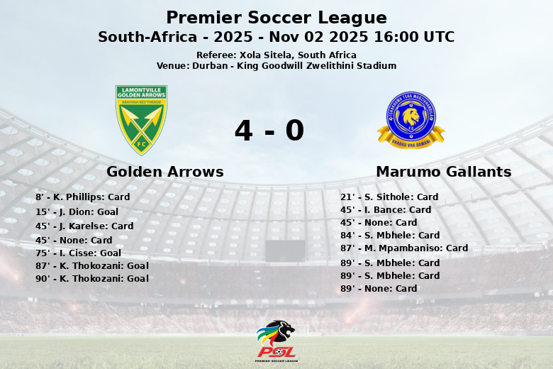 Durban, África do Sul – Em um jogo repleto de cartões e gols, o Golden Arrows demonstrou sua superioridade ao derrotar o Marumo Gallants no King Goodwill Zwelithini Stadium. A partida, correspondente à 11ª rodada da Premier Soccer League, terminou com um placar dilatado que refletiu a diferença de efetividade entre as duas equipes.