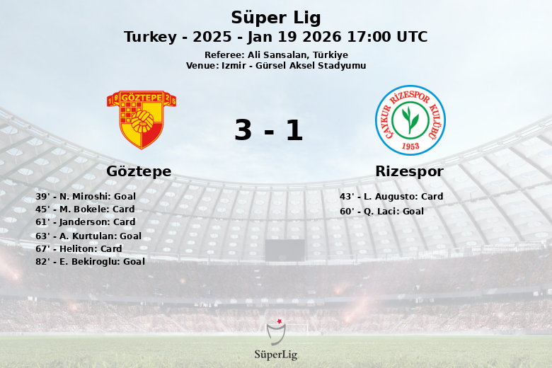N. Miroshi abriu o placar para o Göztepe aos 39 minutos. No entanto, o Rizespor respondeu no segundo tempo, empatando a partida aos 60 minutos com um pênalti convertido por Q. Laci. A alegria do Rizespor durou pouco, pois A. Kurtulan colocou o Göztepe novamente na frente aos 63 minutos com assistência de Juan Santos. O Göztepe selou a partida aos 82 minutos, quando E. Bekiroglu marcou.