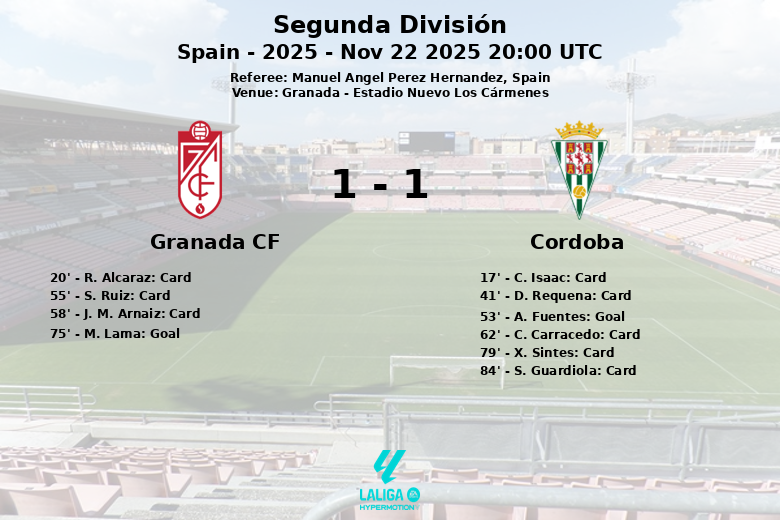 Granada, Espanha – Em um jogo disputado no Estadio Nuevo Los Cármenes, Granada CF e Córdoba CF empataram em uma partida que teve de tudo: gols, cartões e momentos de tensão. O Córdoba abriu o placar aos 53 minutos com um gol de A. Fuentes, assistido por C. Carracedo, despertando a alegria na torcida visitante. No entanto, o Granada não desistiu e, aos 75 minutos, M. Lama igualou o marcador, devolvendo a esperança à torcida local. A partida foi marcada pela intensidade no meio-campo, refletida nos numerosos cartões amarelos mostrados pelo árbitro, Manuel Angel Perez Hernandez. O Córdoba dominou ligeiramente a posse de bola com 52%, embora o Granada tenha gerado mais oportunidades de gol, com 16 chutes no total, contra 11 do Córdoba. O Granada terminou com 7 escanteios, contra 8 do Córdoba. Quanto aos cartões, o Granada acumulou 3 cartões amarelos, enquanto o Córdoba recebeu 5. A partida, correspondente à 15ª rodada da Segunda Divisão, deixou um gosto agridoce para ambas as equipes, que buscarão melhorar em seus próximos compromissos. O resultado final foi um empate.