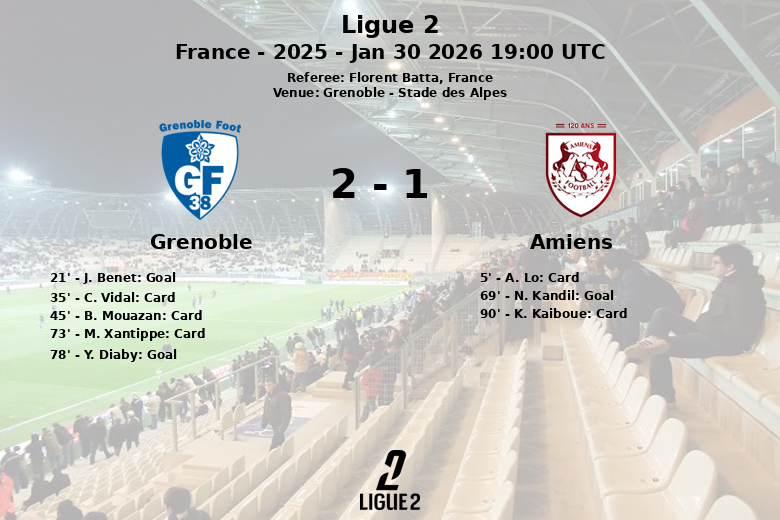 A partida começou com intensidade, refletida no cartão amarelo para A. Lo do Amiens aos 5 minutos. O Grenoble adiantou-se no marcador aos 21 minutos graças a um golo de J. Benet, assistido por L. Mouyokolo. No entanto, o Amiens não desistiu e N. Kandil empatou aos 69 minutos. A alegria do Amiens durou pouco, pois Y. Diaby voltou a colocar o Grenoble na frente aos 78 minutos. O jogo foi marcado por faltas, com 16 para o Grenoble e 10 para o Amiens, resultando em três cartões amarelos para os anfitriões e um para os visitantes. O encontro terminou com um amargo empate.