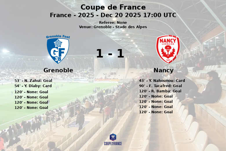 Grenoble, França – Em um jogo eletrizante disputado no Stade des Alpes pela Coupe de France, o Nancy garantiu uma vitória dramática sobre o Grenoble após uma disputa de pênaltis que manteve os torcedores na ponta de seus assentos. O jogo, disputado em 20 de dezembro de 2025, terminou empatado em 2-2 após a prorrogação, forçando a decisão nos pênaltis.