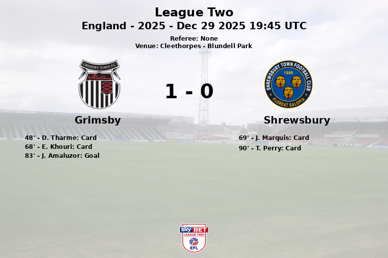 O jogo permaneceu equilibrado até os minutos finais, com vários cartões amarelos mostrados para ambas as equipes: D. Tharme e E. Khouri pelo Grimsby, e J. Marquis e T. Perry pelo Shrewsbury. O impasse foi quebrado aos 83 minutos, quando J. Amaluzor marcou para o Grimsby, dando a vitória à equipe da casa. O Grimsby também superou o seu rival no número de escanteios, com 6 em comparação com os 2 do Shrewsbury. No entanto, o jogo foi marcado por inúmeras faltas, 14 para o Shrewsbury e 6 para o Grimsby.