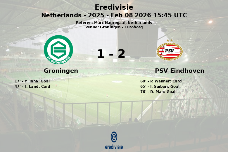 No entanto, o domínio do PSV Eindhoven na posse de bola (63% contra 37% do Groningen) acabou se traduzindo em gols no segundo tempo. I. Saibari empatou o placar aos 65 minutos, após uma assistência de Mauro Junior, e D. Man marcou o gol definitivo de 1-2 aos 76 minutos, com Saibari novamente envolvido na assistência.