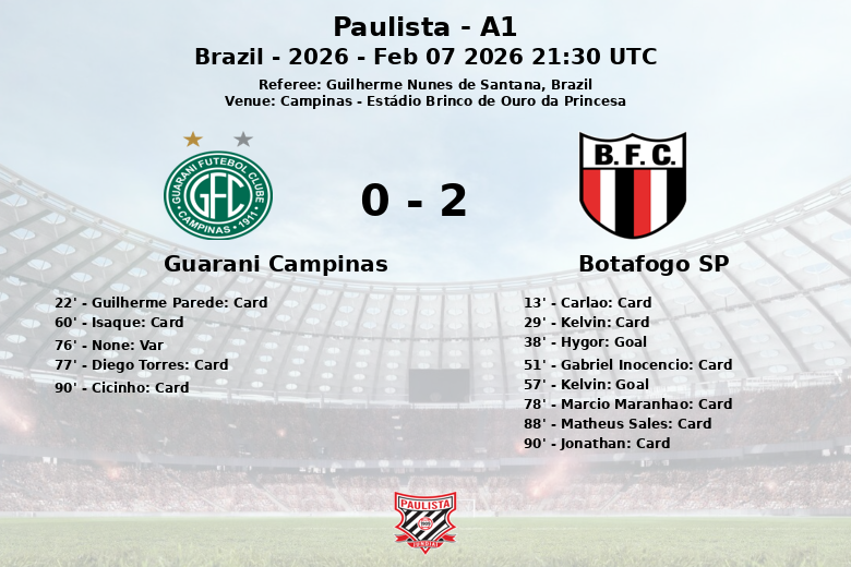 Campinas – O Botafogo SP venceu o Guarani Campinas em uma partida carregada de emoções e cartões, disputada no Estádio Brinco de Ouro da Princesa. O encontro, válido pela sétima rodada da temporada regular do Paulista A1, terminou com um placar favorável à equipe visitante graças aos gols de Hygor aos 38 minutos e Kelvin aos 57 minutos, ambos com assistência de Rafael Gava.