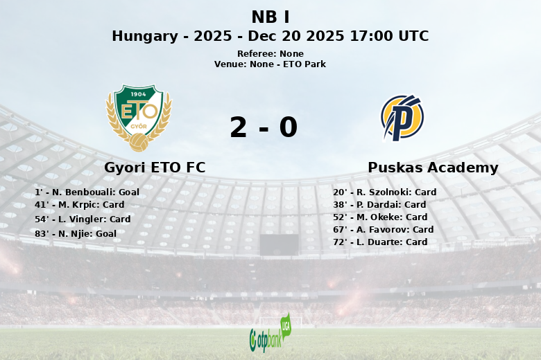 O ETO Park testemunhou uma vitória contundente do Gyori ETO FC sobre o Puskas Academy em um jogo da NB I. A partida, disputada no âmbito da temporada de 2025, rodada da Fase Regular – 18, foi caracterizada pelo domínio do Gyori ETO FC na posse de bola (57%) e maior eficácia em frente ao gol.
