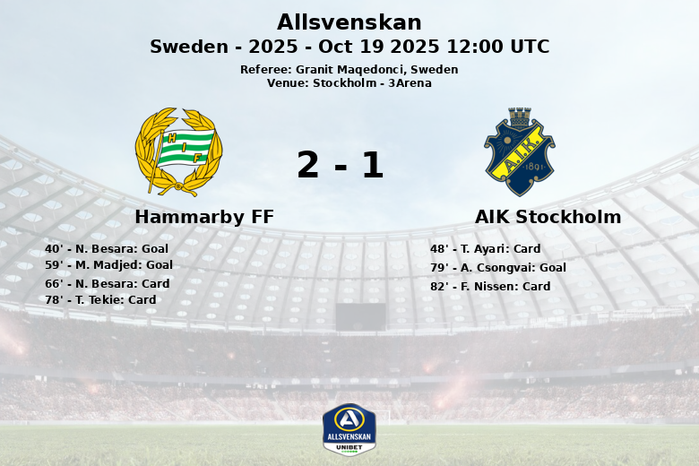 N. Besara abriu o placar para o Hammarby aos 40 minutos, com assistência de M. Madjed. No segundo tempo, aos 59 minutos, M. Madjed ampliou a vantagem com um gol assistido por A. Lahdo. O AIK respondeu aos 79 minutos com um gol de A. Csongvai, mas não foi suficiente para igualar o placar.