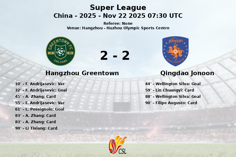 A partida foi marcada pela intensidade no meio-campo, refletida no número de faltas cometidas por ambas as equipes. A expulsão de A. Zhang aos 83 minutos, após receber o segundo cartão amarelo, complicou ainda mais o panorama para o Hangzhou Greentown nos minutos finais. Quanto às estatísticas, o Qingdao Jonoon teve uma ligeira vantagem na posse de bola (52% contra 48% do Hangzhou Greentown) e maior precisão nos chutes a gol (9 contra 5).