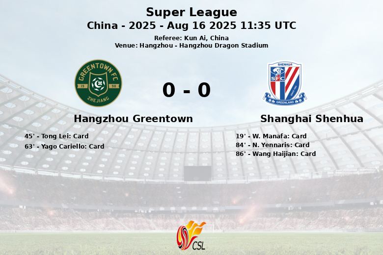 Hangzhou, China – Uma partida disputada e tática entre Hangzhou Greentown e Shanghai Shenhua terminou em um empate de 0-0 no Estádio Dragão de Hangzhou. A partida, correspondente à 21ª rodada da Super League de 2025, foi marcada pela intensidade e pelo jogo físico, refletidos nos cinco cartões amarelos mostrados pelo árbitro Kun Ai.