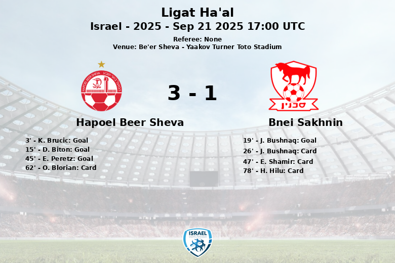 Be’er Sheva, Israel – Em uma partida correspondente à quarta rodada da temporada regular da Ligat Ha’al, o Hapoel Beer Sheva derrotou o Bnei Sakhnin no Yaakov Turner Toto Stadium. O jogo, disputado em 21 de setembro de 2025, foi marcado pela intensidade e uma diferença significativa na posse de bola.