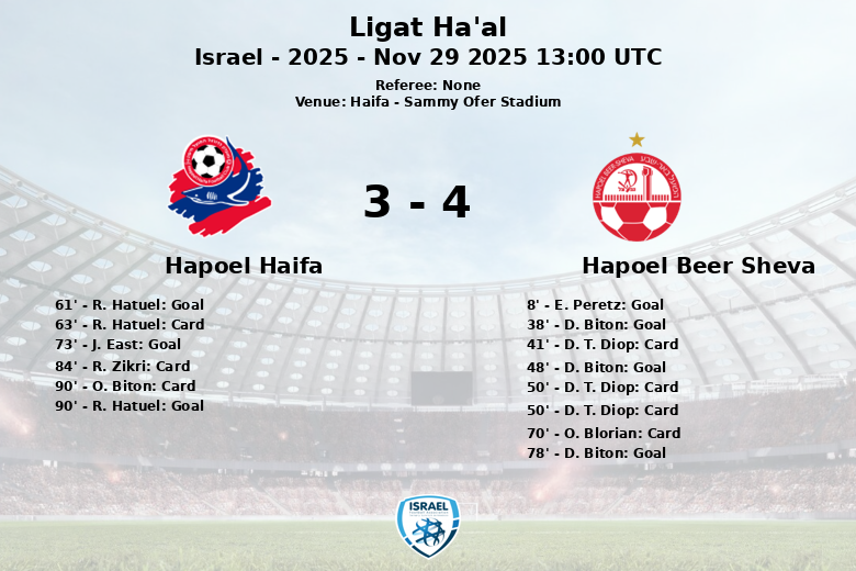 Substituiões na equipe de hapoel haifa: Aos 52 minutos, A. Forat Ayias entrou e R. Ndo saiu., Aos 52 minutos, Sana entrou e O. Biton saiu., Aos 53 minutos, I. Buganim entrou e R. Hatuel saiu., Aos 60 minutos, Y. Ferber entrou e R. Zikri saiu., Aos 80 minutos, O. Biton entrou e Y. Gonen saiu.