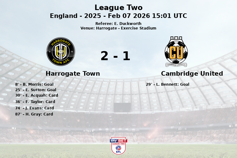 O Harrogate Town começou forte, abrindo o placar aos 8 minutos com um gol de B. Morris. A vantagem foi ampliada aos 25 minutos com um gol de E. Sutton, após assistência de E. Taylor. No entanto, o Cambridge United reagiu e L. Bennett diminuiu o placar aos 29 minutos, mantendo as esperanças de sua equipe vivas.