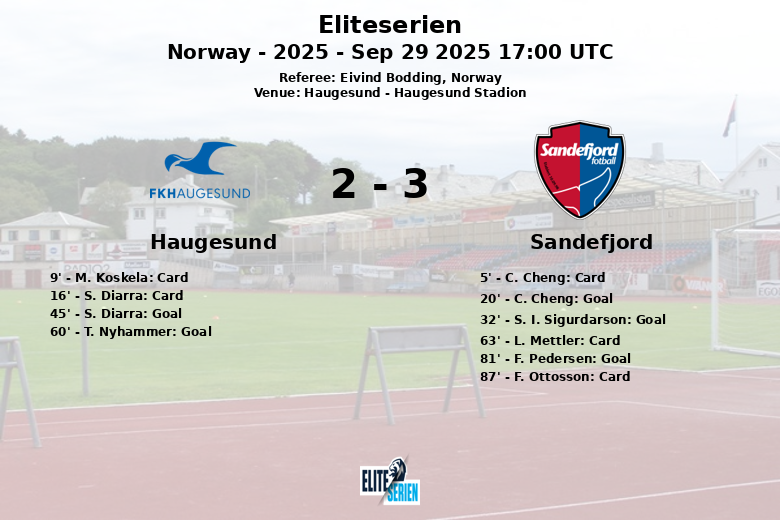 O Sandefjord assumiu a liderança cedo com um gol de C. Cheng aos 20 minutos, após receber uma advertência inicial aos 5 minutos. Posteriormente, S. I. Sigurdarson ampliou a vantagem aos 32 minutos com assistência do mesmo Cheng. O Haugesund respondeu antes do intervalo graças a um pênalti convertido por S. Diarra aos 45 minutos.