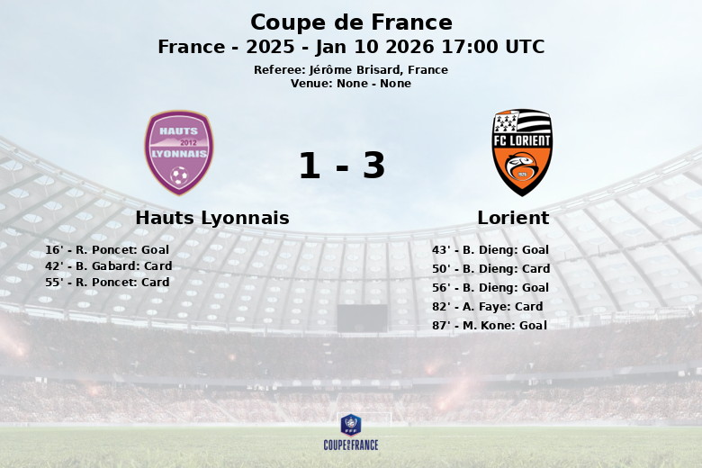 Um jogo vibrante da Coupe de France viu o Lorient triunfar sobre o Hauts Lyonnais num confronto onde a eficácia em frente ao gol fez a diferença. O Hauts Lyonnais começou forte, abrindo o placar aos 16 minutos graças a um gol de R. Poncet, assistido por S. Messili. No entanto, o Lorient não se intimidou e, pouco antes do intervalo, B. Dieng empatou.