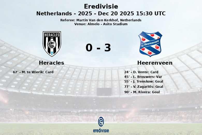 O segundo tempo viu o Heerenveen concretizar seu domínio. J. Trenskow abriu o placar aos 55 minutos, assistido por D. Vente. V. Zagaritis ampliou a vantagem aos 77 minutos com um gol assistido por M. Rivera. Finalmente, M. Rivera selou a vitória com um gol de pênalti aos 90 minutos, estabelecendo um resultado final favorável à equipe visitante. O Heracles recebeu um cartão amarelo para M. te Wierik aos 67 minutos. A arbitragem ficou a cargo de Martin Van den Kerkhof.