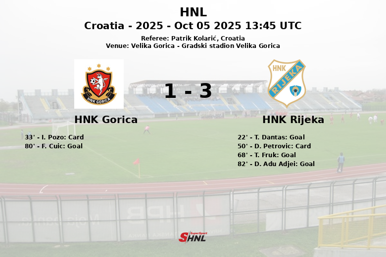 Velika Gorica, Croácia – Em uma partida vibrante e cheia de alternativas, o HNK Rijeka triunfou sobre o HNK Gorica no Gradski stadion Velika Gorica. A partida, correspondente à nona rodada da HNL, Temporada 2025, foi arbitrada por Patrik Kolarić.