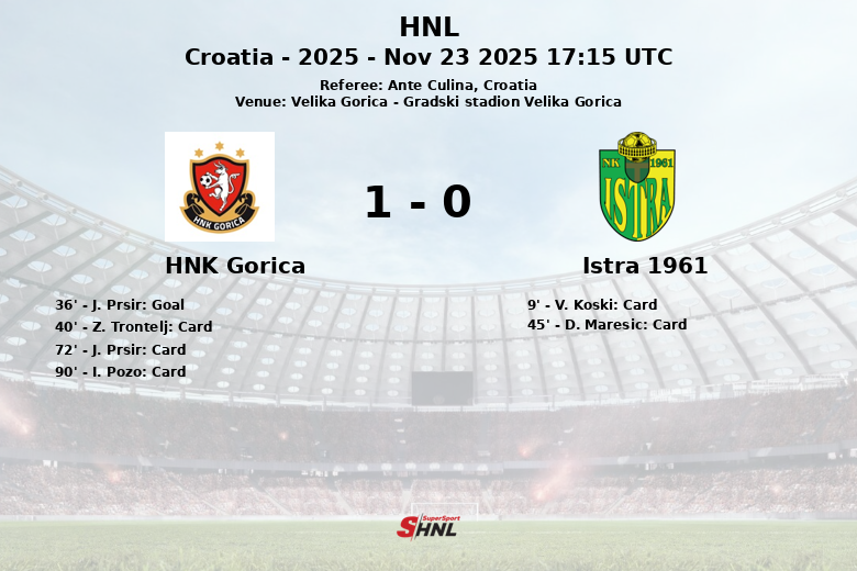 O único gol da partida surgiu aos 36 minutos, marcado por J. Prsir após assistência de I. Pozo, dando ao HNK Gorica a vantagem decisiva.