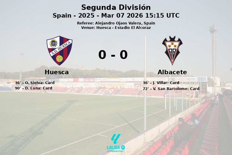 Huesca e Albacete protagonizaram um encontro disputado no Estádio El Alcoraz que finalizou com um empate sem gols. A partida, correspondente à 29ª jornada da Segunda Divisão, foi caracterizada pela intensidade no meio-campo e a luta pela posse da bola.