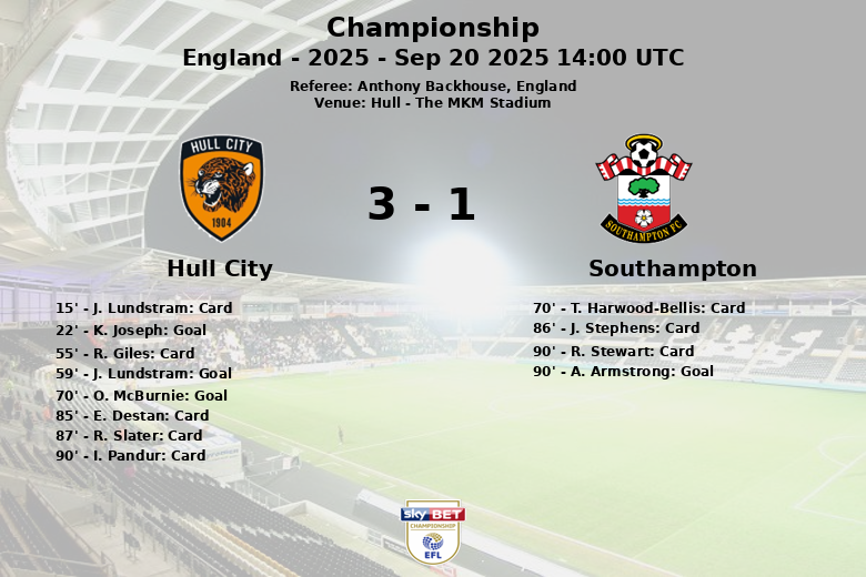 Hull, Inglaterra – Em uma partida disputada no The MKM Stadium, o Hull City superou o Southampton em um jogo do Championship marcado pela intensidade e inúmeras advertências. A partida, jogada em 20 de setembro de 2025, viu o Hull City aproveitar ao máximo suas oportunidades, apesar de ter apenas 29% de posse de bola.