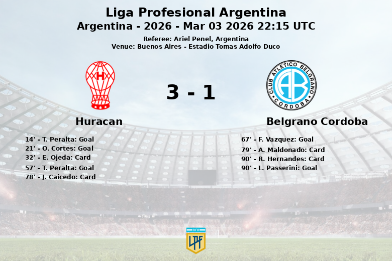 A partida foi caracterizada por um jogo disputado, com 12 faltas cometidas pelo Huracán e 10 pelo Belgrano. Houve tensão nos minutos finais, com cartões amarelos para J. Caicedo (Huracán), A. Maldonado e R. Hernandes (Belgrano). No último minuto, L. Passerini perdeu um pênalti, desperdiçando a oportunidade de aproximar sua equipe no placar. Apesar de seus esforços, o Belgrano só conseguiu registrar 9 chutes, com apenas 2 direcionados ao gol. Os três gols do Huracán foram decisivos para a vitória.