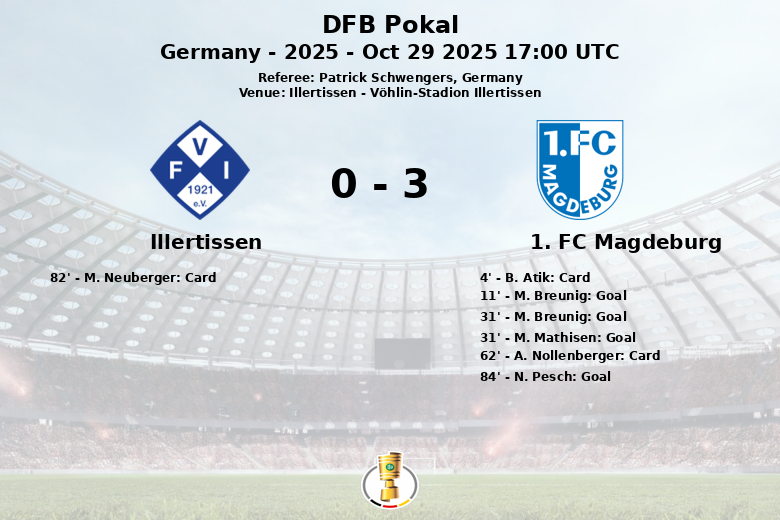 No segundo tempo, o Magdeburg continuou a pressionar, e N. Pesch selou a vitória com um gol aos 84 minutos, graças a uma assistência de R. Ghrieb. O Illertissen, por outro lado, teve dificuldades para criar perigo, com apenas um chute a gol em sete tentativas. A partida também teve cartões amarelos para B. Atik e A. Nollenberger do Magdeburg, e para M. Neuberger do Illertissen. O Magdeburg terminou a partida com 21 chutes, dos quais 8 foram a gol, enquanto o Illertissen conseguiu apenas um chute a gol. A partida culminou com uma clara vitória para o 1. FC Magdeburg, que avança na DFB Pokal.