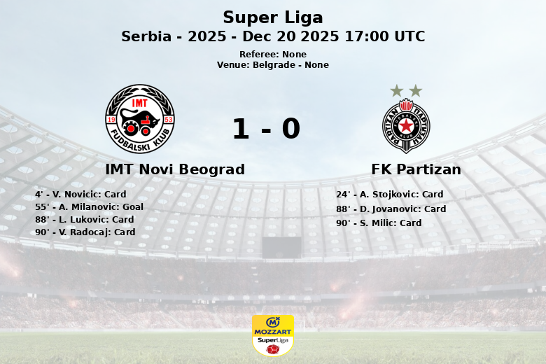 Belgrado, Sérbia – Em um jogo disputado na tarde de sábado, o IMT Novi Beograd garantiu uma vitória apertada sobre o FK Partizan, em partida válida pela 20ª rodada da Super Liga Sérvia. Um único gol, marcado por A. Milanovic aos 55 minutos com assistência de V. Novicic, foi o suficiente para garantir os três pontos para a equipe visitante.