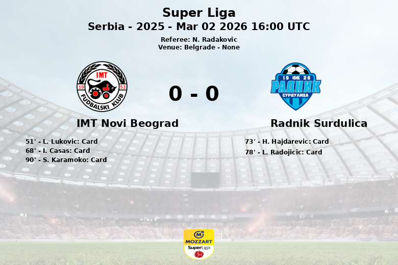 Belgrado, Sérvia – Em uma partida correspondente à 25ª rodada da Super Liga, o IMT Novi Beograd e o Radnik Surdulica se enfrentaram em um jogo onde a posse de bola favoreceu claramente a equipe da casa. O IMT Novi Beograd controlou a bola por 60% do tempo, gerando 13 tentativas de chute, sendo 4 no alvo e 6 para fora. No entanto, a falta de precisão no ataque impediu que eles traduzissem seu domínio em gols. A equipe da casa também gerou 6 escanteios, mostrando sua insistência na área adversária.