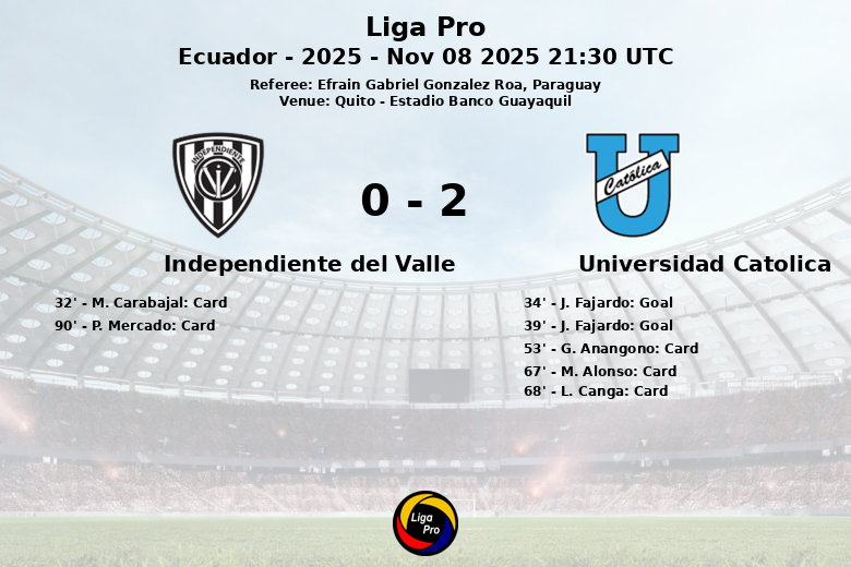Um momento chave da partida foi a expulsão de M. Carabajal aos 32 minutos, deixando o Independiente del Valle com dez jogadores. Pouco depois, J. Fajardo abriu o placar para a Universidad Católica aos 34 minutos em cobrança de pênalti. Fajardo ampliou a vantagem aos 39 minutos, consolidando o domínio da equipe visitante.