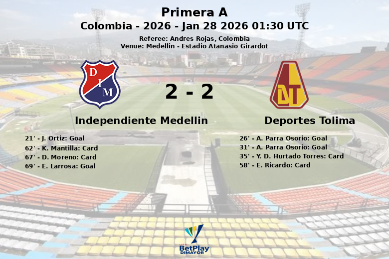 Medellín, Colômbia – Em uma partida cheia de emoções e controvérsias, o Independiente Medellín superou o Deportes Tolima com um placar final de 2 a 2 no Estádio Atanasio Girardot. A partida, correspondente à terceira rodada da temporada regular da Primera A, foi marcada por duas expulsões para a equipe visitante e um domínio de bola notável por parte do time da casa, que alcançou 68% de posse de bola.