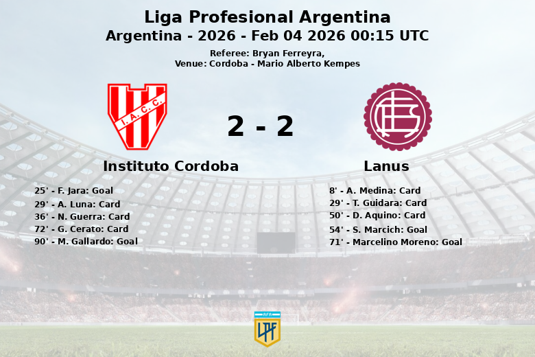 Em uma partida disputada no Mario Alberto Kempes em Córdoba, o Lanús conseguiu garantir um empate contra o Instituto, com um placar final de dois a dois. A partida, válida pela terceira rodada da Liga Profesional Argentina, foi intensa desde o início e foi caracterizada por um alto número de advertências, com três cartões amarelos mostrados para cada equipe.