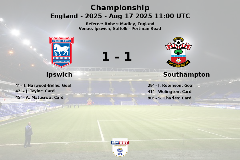 Ipswich, Suffolk – Em uma partida disputada em Portman Road, Ipswich e Southampton empataram em um jogo correspondente à segunda rodada do Championship. A partida, arbitrada por Robert Madley, foi repleta de intensidade e momentos-chave.