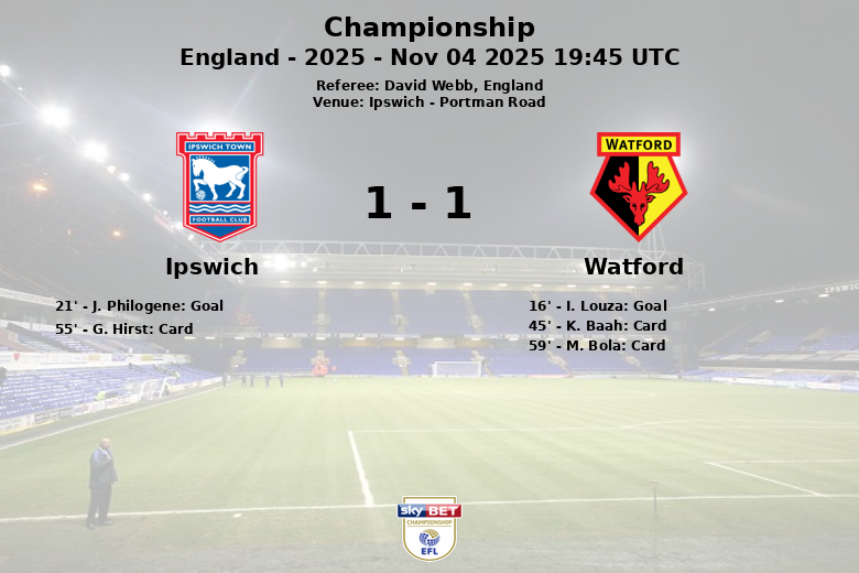 O Watford abriu o placar aos 16 minutos com um gol de I. Louza, após uma jogada bem construída. No entanto, a alegria dos visitantes durou pouco, já que J. Philogene empatou para o Ipswich aos 21 minutos, com assistência de C. Kipre.