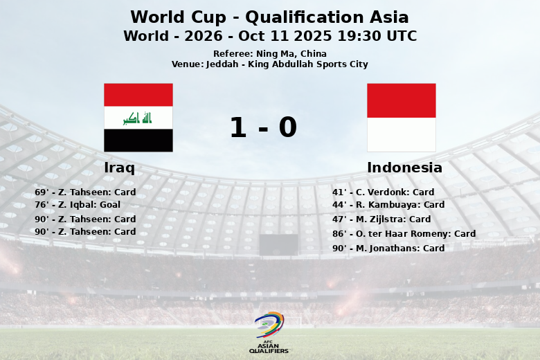 Jeddah, Arábia Saudita – Em uma partida cheia de tensão e cartões, o Iraque derrotou a Indonésia por uma margem estreita no King Abdullah Sports City. O jogo, válido pela qualificação asiática para a Copa do Mundo de 2026, foi arbitrado pelo chinês Ning Ma. A Indonésia dominou a posse de bola com 55% em comparação com os 45% do Iraque, mas a eficácia iraquiana fez a diferença. O Iraque garantiu a vitória com um gol de Z. Iqbal aos 76 minutos, assistido por Y. Amyn. A partida foi marcada por um alto número de faltas cometidas pela Indonésia (18) em comparação com as do Iraque (6). O árbitro mostrou seis cartões amarelos para a equipe indonésia e dois para a equipe iraquiana, além de um cartão vermelho para Z. Tahseen nos minutos finais. Embora a Indonésia tenha tentado criar perigo com nove chutes (apenas um no alvo), a defesa iraquiana permaneceu sólida. O Iraque, por sua vez, fez sete chutes (dois no alvo e quatro para fora).