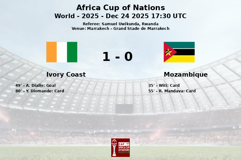 Marrakech, Marrocos – A Costa do Marfim iniciou sua campanha na Copa Africana de Nações de 2025 com uma vitória por 1-0 sobre Moçambique no Grand Stade de Marrakech. Em uma partida disputada em 24 de dezembro, sob a arbitragem do ruandês Samuel Uwikunda, os “Elefantes” dominaram a posse de bola com 54% contra 46% de Moçambique. O único gol do jogo foi marcado aos 49 minutos, por A. Diallo, assistido por F. Kessie, após uma jogada ofensiva bem elaborada. Moçambique tentou responder, mas teve suas oportunidades de ataque limitadas, registrando apenas 3 chutes no total, um deles no alvo. O jogo foi marcado pela intensidade no meio-campo, resultando em cartões amarelos para Witi e R. Mandava por Moçambique, e para Y. Diomande pela Costa do Marfim. A Costa do Marfim gerou mais perigo ofensivo com 15 chutes no total, 5 dos quais foram no alvo, e obteve 9 escanteios. O encontro, correspondente à primeira rodada da fase de grupos, deixou a Costa do Marfim com uma importante vitória inicial.