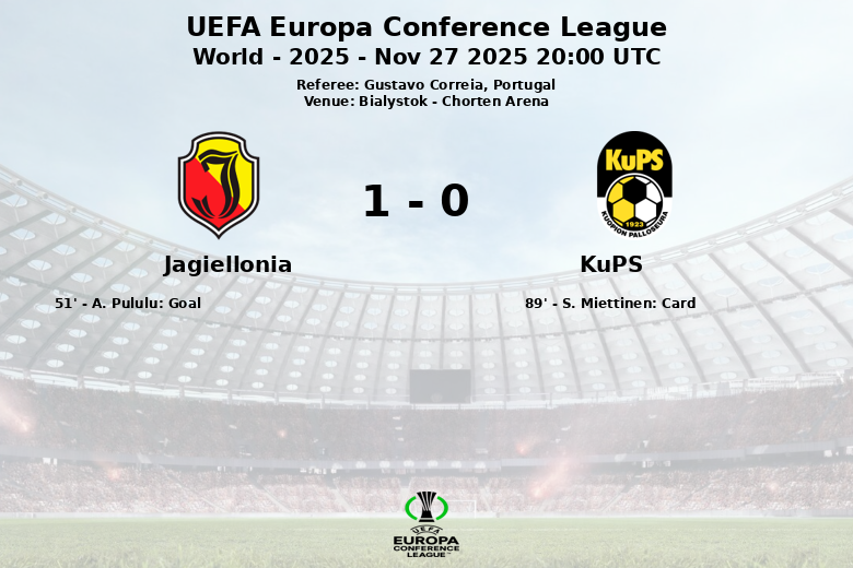 O único gol da partida surgiu aos 51 minutos, cortesia de um gol de A. Pululu para o Jagiellonia. A equipe da casa demonstrou maior agressividade ofensiva, com 17 chutes no total, dos quais 9 foram ao alvo, em comparação com os 7 chutes do KuPS, com apenas um acertando o alvo.